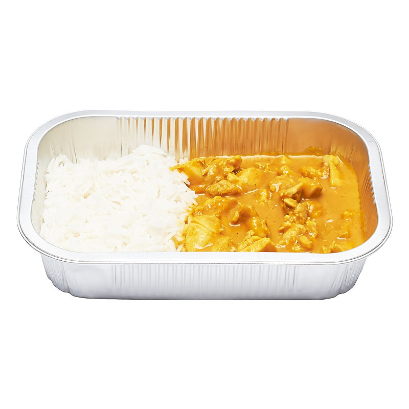 Caril de frango (62,5 %) [carne de frango (44,9 %), leite coco (13,8 %) [extrato de coco, água, espessantes: E412, E466, emulsionante: E435], polpa de manga (6,9 %) [manga (alphonso) (90 %), açúcar, água e regulador de acidez (ácido cítrico)], cebola, óleo alimentar [óleo de girassol refinado, óleo de bagaço de azeitona refinado (em proporções variáveis) e aroma natural de ervas], CARIL (1 %) [curcuma, amido de arroz, alforva, cominhos, coentros, funcho, canela, alho, pimenta preta, pimentão picante e AIPO], tomate concentrado, alho, sal, pimenta e louro]; Arroz basmati (37,5 %) [arroz basmati cozido (96,9 %), óleo girassol, alho e sal].